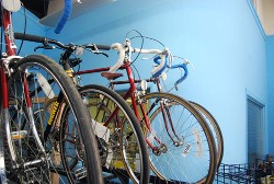 Bikes for sale in the newly painted shopEverything is Blue: About a month ago or so a group of us got together and painted our retail shop. We covered up the grease marks and holes in the wall to make a better looking environment for you to bring your bike into. We also rebuilt our counters, painted them and reorganized our shop area. It is a continual process but if you haven’t been in the shop in a while, it is worth it to come in and see the space transformed!